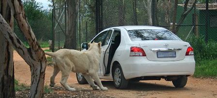 據(jù)報(bào)道,在南非約翰內(nèi)斯堡野生獅子動(dòng)物園,一輛白色豐田車的車主粗心大意,沒有按照?qǐng)@方叮囑鎖好車門,結(jié)果真的讓一頭獅子“盯上”了。這只重約136公斤的獅子走近汽車,用嘴來回摸索,竟然用牙齒咬住了車門的把手,將車輛左后方的車門拉開了。而車主尚在車內(nèi),被嚇得一動(dòng)也不敢動(dòng),完全驚呆了,像是難以置信。