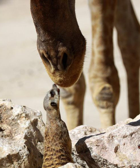 中新網(wǎng)2月22日電 據(jù)臺(tái)灣“今日新聞”22日援引英媒報(bào)道,看過動(dòng)物星球頻道的《狐獴大宅門》嗎?這里有該頻道沒辦法拍到的畫面──攝影師阿方索帕茲(Alfonso Paz)在葡萄牙里斯本動(dòng)物園直擊,一只厚臉皮的狐獴(又稱貓鼬),竟主動(dòng)向長(zhǎng)頸鹿索吻!逗趣的一瞬間也被拍了下來。