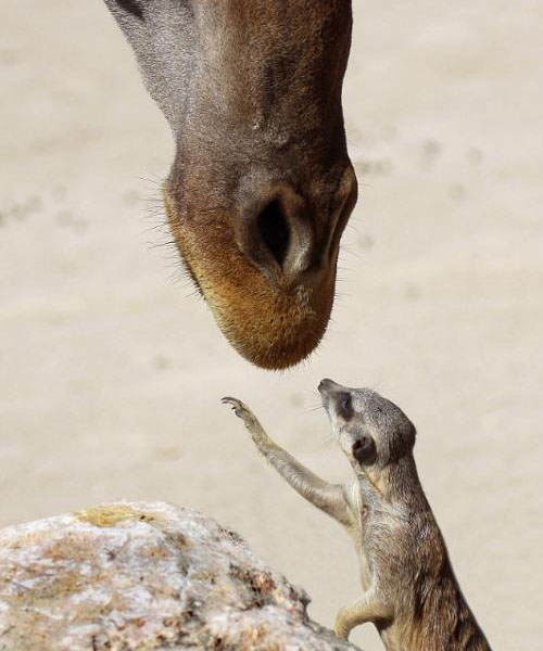 此時(shí),長(zhǎng)頸鹿竟低下頭來和狐獴對(duì)看,“我從來沒看過這種景象!”阿方索說,原先他沒打算拍攝,因?yàn)椤拔也幌M蚱七@種和諧。”不過,當(dāng)長(zhǎng)頸鹿彎身碰到狐獴的頭,看起來就像狐獴向長(zhǎng)頸鹿索吻,甚至還“伸手”摸摸長(zhǎng)頸鹿。