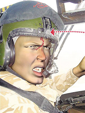 當時塔利班分子的攻勢很激烈,直升機盤旋良久才逮到一個交火較少的機會降落下來,不過當傷員陸續(xù)登上直升機時,對手的襲擊又開始活躍起來。當傷員接載完畢,伊恩冒著彈雨再起飛時,一粒子彈剛巧擊中他的頭盔前部一塊用于安裝夜視鏡的金屬架,子彈從這里穿透了頭盔,射中他的眉心。鮮血從伊恩的額頭涌了出來,一直流到他的眼睛。此時更多的子彈射了進來,支奴干的控制臺被擊中,穩(wěn)定系統(tǒng)無法工作。但伊恩仍然努力控制直升機,繼續(xù)飛行了大約8分鐘,順利降落基地?哲娤⑷耸空f,如果子彈射低一毫米,又欠缺這位機師的駕駛技術(shù),機上所有人相信無機會生還。