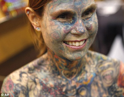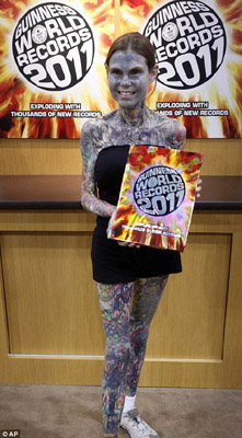 中新網(wǎng)5月27日電 據(jù)英國(guó)媒體報(bào)道,美國(guó)女孩希努斯(Julia Gnuse)全身95%都覆蓋著五顏六色的紋身。她也被吉尼斯世界紀(jì)錄評(píng)為世界上紋身最多的女人。5月26日,她出席了紐約圖書(shū)博覽會(huì),也展示了自己身上的紋身。