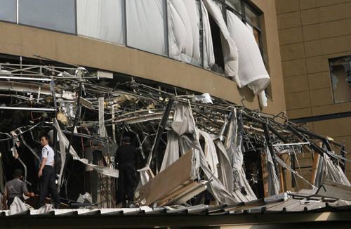 一位在麗思-卡爾頓酒店附近工作的目擊者看見酒店的一些窗戶被炸得粉碎,大部分都是低層的窗戶。酒店外墻受到嚴(yán)重?fù)p毀,窗戶玻璃炸至粉碎,大量碎片散落在人行道上,萬豪酒店則有煙冒出。據(jù)中國駐當(dāng)?shù)厥桂^人員表示,南航駐當(dāng)?shù)剞k公室距離萬豪酒店不過500米,玻璃被震碎。