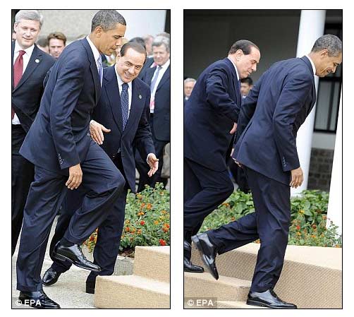 據(jù)英國《每日郵報(bào)》7月9日報(bào)道,作為G8峰會上的重量級人物,奧巴馬的到來讓意大利總理貝盧斯科尼喜出望外。然而這次貝氏可謂是“熱臉貼上了冷屁股”,他滿臉堆笑地伸出手,要和奧巴馬握手,但對方卻對他“視而不見”,直接從他前面走過。