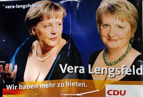 據(jù)新加坡《聯(lián)合早報》報道,德國基督教民主聯(lián)盟成員倫斯費爾德將在下個月27日的選舉中,競選柏林一個左翼選區(qū)的議席。她的競選團隊最近張貼的競選海報,展示了她本人和默克爾并列在一起的照片。兩人都穿上低胸晚裝,露出了性感乳溝,上頭還打上“我們還有更多可以奉獻”的標(biāo)語。