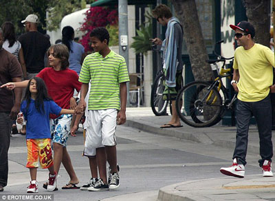 據(jù)報道,25歲的哈提穿著黃色的T恤、牛仔褲,同12歲的Prince和留了長發(fā)的7歲的Blanket出現(xiàn)在加州圣莫尼卡街頭,他們正要一同去書店。和他們在一起的還有一個朋友和一個負(fù)責(zé)照看他們的人,一行人看上去興致勃勃,心情不錯。
