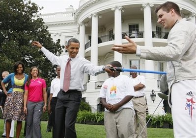 中新網(wǎng)9月17日電 綜合媒體報(bào)道,奧巴馬16日在白宮南草坪“耍劍”,他還與曾在北京奧運(yùn)會(huì)擊劍項(xiàng)目中獲得銀牌的莫豪斯較量起來。