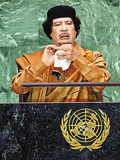 中新網(wǎng)9月25日電 利比亞領(lǐng)袖卡扎菲上臺(tái)40年,前天終于首次在聯(lián)合國(guó)大會(huì)上發(fā)言,一講就1小時(shí)36分鐘,遠(yuǎn)遠(yuǎn)超出規(guī)定的15分鐘。據(jù)香港《文匯報(bào)》報(bào)道,其間他批評(píng)聯(lián)合國(guó)安理會(huì)是“恐怖理事會(huì)”,指聯(lián)合國(guó)自成立以來(lái)未能阻止65場(chǎng)戰(zhàn)爭(zhēng)爆發(fā),更將聯(lián)合國(guó)憲章扔向聯(lián)合國(guó)官員。