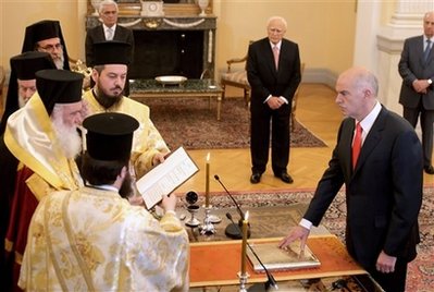 希臘當(dāng)選總理、泛希臘社會(huì)主義運(yùn)動(dòng)(泛希社運(yùn))主席帕潘德里歐6日在總統(tǒng)府正式宣誓就職,并公布了新內(nèi)閣成員名單。