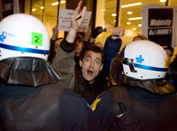 示威人群揮舞著鳶尾花旗(fleur-de-lis,波旁王朝復辟時,王室使用的旗幟),大喊口號,扔雞蛋抗議。有的示威者坐在街道中間,導致查爾斯原定參加的出席儀式被迫取消。