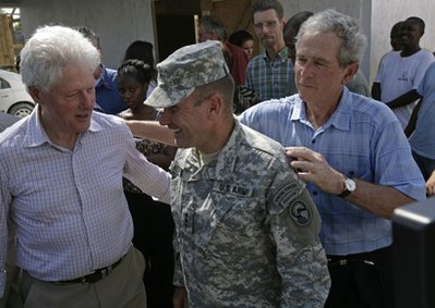 這兩位前總統(tǒng)是于本周一到海地進(jìn)行人道訪(fǎng)問(wèn),視察當(dāng)?shù)?月12日大地震后的災(zāi)情。兩人特地到首都太子港探訪(fǎng)災(zāi)民,當(dāng)經(jīng)過(guò)頹垣敗瓦的廢墟時(shí),不約而同和居于臨時(shí)帳篷的災(zāi)民握手。