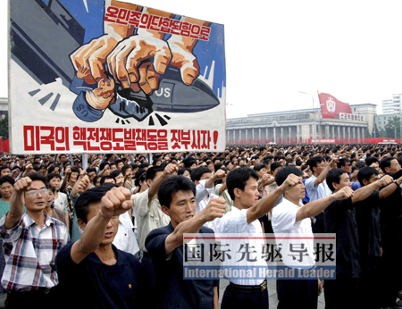 今年的6月25日是朝鮮戰(zhàn)爭爆發(fā)59周年紀念日,也是朝鮮的“反美斗爭日”。前兩年,朝鮮在平壤體育館舉行規(guī)模相對較小的“反美斗爭日”群眾大會,而今年則改在金日成廣場舉行,參加大會的人數(shù)達到10萬名。《國際先驅(qū)導(dǎo)報》記者應(yīng)邀參加了這次大會。偌大的廣場上紅旗招展,人頭攢動。“消滅朝鮮人民的不共戴天的敵人——美帝侵略者”、“趕走美帝,統(tǒng)一祖國”、“在反美大決戰(zhàn)中顯示英雄的朝鮮人民的本色”等標語和宣傳畫隨處可見。
