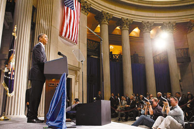 演說于當(dāng)?shù)貢r間14日正午12時10分舉行,地點(diǎn)是紐約聯(lián)邦國家紀(jì)念堂,鄰近紐約證券交易所。奧巴馬重申上任以來穩(wěn)定經(jīng)濟(jì)措施的成效,并強(qiáng)調(diào)華府已成功避免第2次大蕭條重臨。