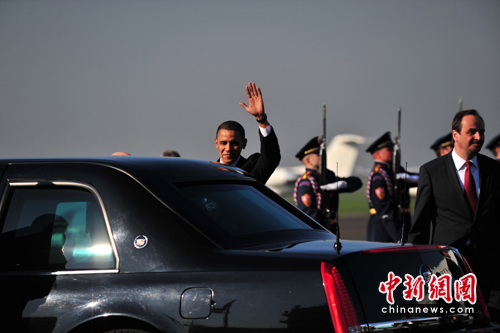 奧巴馬總統(tǒng)于當(dāng)?shù)貢r(shí)間8日上午9時(shí)30分(北京時(shí)間8日15時(shí)30分)步下降落在布拉格魯濟(jì)涅老機(jī)場的“空軍一號”專機(jī)舷梯。簽字儀式在兩個半小時(shí)后舉行。