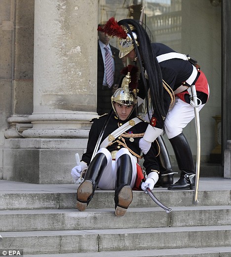 22日,法國總統(tǒng)薩科齊和夫人布魯尼接待前來法國訪問的卡塔爾埃米爾夫婦。在結(jié)束各項(xiàng)接待禮儀后,薩科齊牽著布呂尼的手走進(jìn)愛麗舍宮。而在與守候在外的記者告別前,布魯尼仍不忘微笑揮手,這時(shí)的前超級名?芍^“回眸一笑百媚生”。正當(dāng)記者們狂按相機(jī)時(shí),站在愛麗舍宮正門外臺階上的一名衛(wèi)兵也“激動(dòng)的不行”,以致眼神發(fā)直,腿軟倒地,另外一名衛(wèi)兵見狀趕緊上前攙扶。