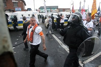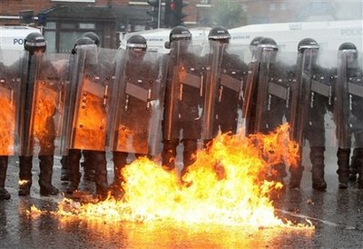 13日晚,在貝爾法斯特參加游行的新教徒向防暴警察投擲汽油彈、焰火和磚塊,警察則以高壓水槍還擊。在雙方的對(duì)峙中,警方至少開出一槍,而有6枚燃燒彈被擲向了防暴警察。