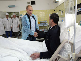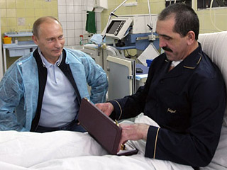 據(jù)俄羅斯新聞網(wǎng)報道,7月30日俄羅斯總理普京前往莫斯科維什涅夫斯基外科醫(yī)學研究所探望一個多月前遇刺后在此療傷的印古什自治共和國總統(tǒng)葉夫庫羅夫,并且贈送一把短劍祝賀當日滿46周歲的他生日快樂。