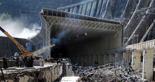俄羅斯最大水電站薩彥-舒申斯克水電站位于俄西伯利亞地區(qū)哈卡斯共和國境內(nèi),17日清晨,在工作人員執(zhí)行維修工作時(shí),一個(gè)變壓器爆炸,毀壞了引擎室里的墻壁和天花板,并導(dǎo)致室內(nèi)水管壓力激增而爆裂,引擎室被水淹沒,造成水災(zāi)。據(jù)悉,水電站大壩本身沒有受損,也沒有對當(dāng)?shù)鼐用顸c(diǎn)造成威脅。