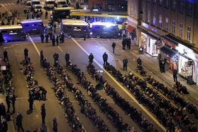 近日來,在哥本哈根舉行的示威活動大部分是和平的,但是在當(dāng)天的集會中,有數(shù)百名身穿黑衣的年輕人在街上投磚頭,砸窗戶,警方對此進行了干預(yù)。防暴警察包圍了鬧事者,要求他們坐在地上,把手放在身后,然后被集體押上警車。