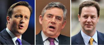 工黨領(lǐng)袖、現(xiàn)任首相布朗,保守黨領(lǐng)袖卡梅倫和自民黨領(lǐng)袖克萊格回答了現(xiàn)場200多名觀眾和電視機前的觀眾通過電子郵件提出的問題。