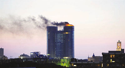 當(dāng)時,其中一座塔樓最高的兩層率先起火,大批消防人員趕到現(xiàn)場撲救。2小時后,一個氣體燃料罐爆炸,消防員被迫撤退,其后從旁邊另一座塔樓向火場噴射水柱滅火,火勢在當(dāng)?shù)貢r間早上6時半左右得到控制。