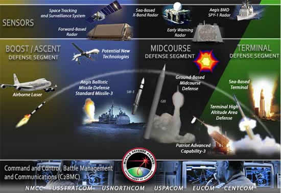 美國彈道導(dǎo)彈防御系統(tǒng)包含衛(wèi)星定位偵察系統(tǒng)、前沿部署雷達(dá)、X波海基雷達(dá)、早期預(yù)警雷達(dá)、宙斯盾雷達(dá)系統(tǒng)的預(yù)警探測系統(tǒng)、空基激光反導(dǎo)武器、宙斯盾平臺搭載的“標(biāo)準(zhǔn)-3”導(dǎo)彈、無人機(jī)等新型武器、陸基中段彈道導(dǎo)彈防御系統(tǒng)、;K端防御武器、“愛國者-3”導(dǎo)彈、終端高空區(qū)域防御導(dǎo)彈系統(tǒng)等武器系統(tǒng)和指揮、控制、戰(zhàn)場管理和通訊系統(tǒng)。