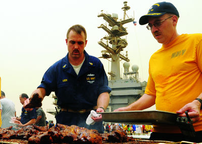 “斯坦尼斯”號(hào)之所以能在眾多航母中脫穎而出,與艦艇上“伙頭軍”的不懈努力分不開。托德·米爾斯是艦上的高級(jí)廚藝專家,領(lǐng)導(dǎo)著57名烹飪專家和80名餐廳服務(wù)員。在介紹成功經(jīng)驗(yàn)時(shí),米爾斯說(shuō),“有三個(gè)條件:高品質(zhì)的食材、確保廚房干凈和安全,如果你能確保這三點(diǎn),那么就能贏得海軍廚藝大獎(jiǎng)”。海軍士官長(zhǎng)、艦上餐飲官內(nèi)斯特·法度對(duì)此卻有著另一番看法,他說(shuō):“主要還是人的因素,我們勝過(guò)其他航母的秘訣就是靠態(tài)度、服務(wù)和菜的花色!
