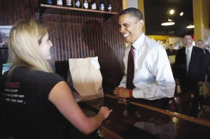 據(jù)法新社消息,美國(guó)總統(tǒng)奧巴馬13日在紐約州布法羅時(shí),突然造訪當(dāng)?shù)匾患乙猿鍪邸八3抢彪u翅”而聞名的小吃店。一名女店員由于見(jiàn)到奧巴馬過(guò)度緊張和興奮,竟一時(shí)口誤,用了極其不雅的詞匯稱贊奧巴馬是“帥哥”。