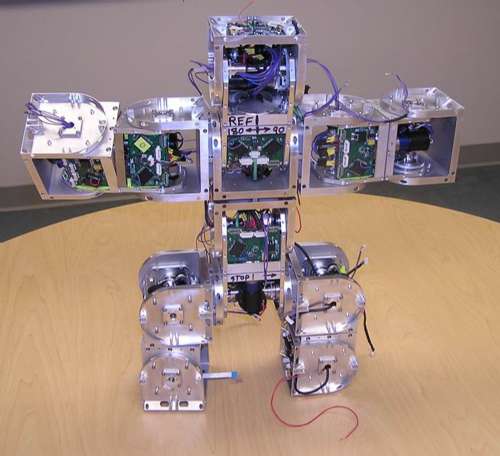 南加州大學(xué)多形態(tài)機(jī)器人學(xué)實(shí)驗(yàn)室兩年多前開始研發(fā)這款“超級(jí)機(jī)械人”(Superbot)。它是由一百塊模塊組成,目前僅完成了頭二十塊。它雖然不能真的像《變形金剛》電影中的機(jī)械人那樣變成貨車或“F-22”戰(zhàn)斗機(jī),但它的變身能力仍令人咋舌:它可以“長(zhǎng)出”一對(duì)、兩對(duì)或三對(duì)“腿子”,可以像蛇那樣滑行,也可以像毛蟲那樣蠕動(dòng)。其中六塊模塊可以形成履帶,有些組合還可以舞動(dòng)繩子。研究主管沈偉明(音譯)稱:“它要攀爬時(shí)可以長(zhǎng)出腿子,要下山時(shí)則可以變成球狀或者索性滾下去!迸c賓夕法尼亞大學(xué)去年展出的模塊機(jī)械人相似,它解體后能夠自我修復(fù)和自我重裝:每個(gè)模塊儼如一個(gè)獨(dú)立的機(jī)械人,而且可以利用紅外線和無線電訊息互相“對(duì)話”;它們又會(huì)一直評(píng)估周遭情況,包括附近有沒有其它模塊,以及它們本身是否需要變成手腳。