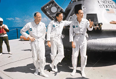 據(jù)香港《文匯報(bào)》報(bào)道,1969年7月,3名宇航員阿姆斯特朗、科林斯和奧爾德林,擠在“阿波羅11號(hào)”里展開他們歷史性的8天旅程。此次紀(jì)念登月40周年,周日3人終于有機(jī)會(huì)再一同出現(xiàn)在公眾面前,并在華盛頓的史密森學(xué)會(huì)國(guó)家航空航天博物館發(fā)表演講,一起談?wù)撎諝v史。這或許將是3位年屆8旬的老人,最后一次集體亮相。