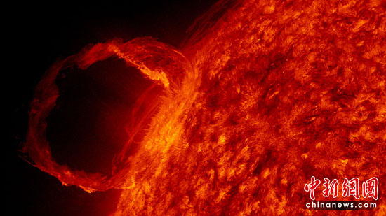 中新網(wǎng)4月23日電 據(jù)日本共同社報道,美國宇航局(NASA)日前公布了一幅由2月發(fā)射升空的太陽觀測衛(wèi)星“SDO”拍攝的巨型日珥照片。拍攝時間為3月30日。據(jù)悉這是首次拍攝到如此清晰的日珥照片,研究人員也對此頗感驚異。