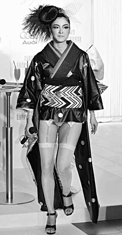 據(jù)香港《文匯報(bào)》報(bào)道,25歲的宮阪幾個(gè)月前在東京展示“改良版”戰(zhàn)衣。和服設(shè)計(jì)大膽,以黑皮革制造,上半身非常密實(shí),但下半身的黑布帶一揭開,春光無限,不但露出桃紅色內(nèi)褲,還有同色絲襪和襪帶。