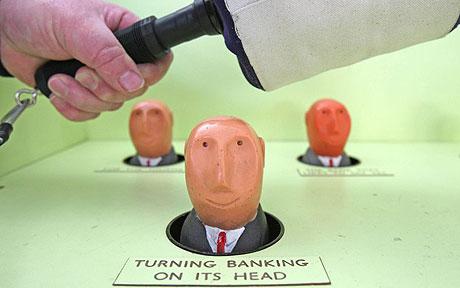 據(jù)英國《每日電訊報(bào)》12月13日?qǐng)?bào)道,經(jīng)濟(jì)衰退下,英國近日流行一種“敲銀行家”(Whack a banker)的游戲,玩家只需支付40便士(約合人民幣4.5元),就可以在銀行家彈出時(shí)重?fù)羲麄,為自己出氣?