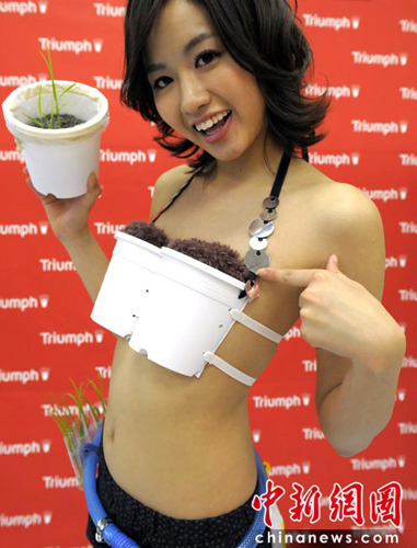 12日,日本東京,模特青山玲子正在展示日本黛安芬公司推出的一款新型內(nèi)衣。這種內(nèi)衣的罩杯是兩個(gè)“花盆”,可以種大米等農(nóng)作物。據(jù)悉,這款內(nèi)衣暫時(shí)不會在市場上發(fā)行、銷售。