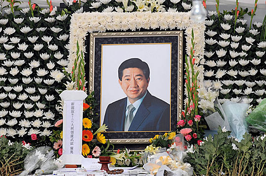 盧武鉉的臨時靈堂23日晚8點40分許,在峰下村會館入口處設(shè)立。在遺屬的祭拜后,開始接受政界人士和普羅百姓的吊唁。據(jù)悉,聚集在會館門前的吊唁訪客里不斷傳出哭泣聲,一些情緒激動的訪客還跑到記者區(qū)前,表示抗議。