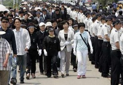 中新網(wǎng)5月26日電 韓國(guó)慶尚南道金海市峰下村25日的白天最高氣溫達(dá)到了30度,當(dāng)天是韓國(guó)前總統(tǒng)盧武鉉逝世的第三天。從村子入口通往盧武鉉靈堂的兩公里長(zhǎng)雙向2車道公路上,沒(méi)有一點(diǎn)兒背陰處。由于警方在村口阻止車輛進(jìn)入,市民們只能頭頂報(bào)紙、手帕、草帽,在往返需要一小時(shí)的炎熱的柏油路上步行前往焚香所。很多人即使汗如雨下也沒(méi)有脫掉黑色的西服上衣。