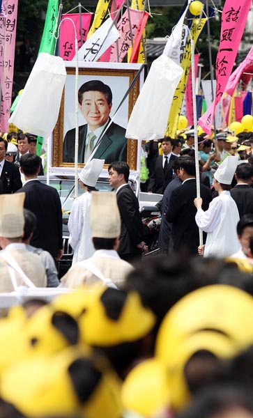 在景福宮遺體告別儀式結束后于中午12時30分出發(fā)的盧武鉉的靈車,經(jīng)由東十字閣、世宗路和太平路,于下午1時20分抵達首爾廣場。