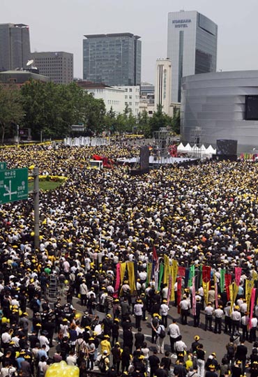 警方估算,首爾廣場一帶云集了18萬名追悼者。大多數(shù)市民頭戴象征故人的黃色太陽帽,并手持黃色氣球追悼盧武鉉。