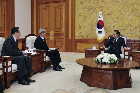 李明博從當(dāng)天上午9時(shí)開始接見朝鮮勞動(dòng)黨中央書記金己男和統(tǒng)一戰(zhàn)線部部長(zhǎng)金養(yǎng)建等一行,就最近的朝韓關(guān)系廣泛地交換了意見。