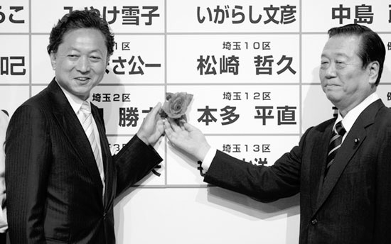 小澤一郎(右)是民主黨眾議院勝選的功臣。圖為他和準(zhǔn)首相鳩山由紀(jì)夫共同把玫瑰花插在當(dāng)選的民主黨候選人名字上
