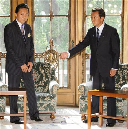 據日本《產經新聞》9月14日報道,即將就任首相的民主黨代表鳩山由紀夫14日下午在國會議事堂內與麻生太郎進行了會談。