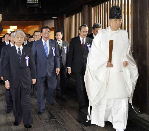 中新網(wǎng)10月21日電 最近幾天,日本政界人士紛紛前往參拜靖國神社。19日,自民黨總裁谷垣禎一進行了參拜,并稱“不僅是二戰(zhàn),這里也祭祀著很多近代史上死去的人。是慰撫這些亡靈的心情”。20日上午,日本跨黨派議員團體“大家一起參拜靖國神社國會議員會”的成員——包括日本眾院副議長衛(wèi)藤征士郎在內(nèi)的54名眾參兩院議員參拜了靖國神社。