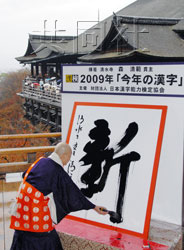 中新網(wǎng)12月11日電 據(jù)日本共同社報道,日本漢字能力檢定協(xié)會11日在京都清水寺宣布“新”字被選為象征2009年日本世態(tài)的漢字。據(jù)該協(xié)會介紹,征集活動共收到161365件應征信,再次刷新去年所創(chuàng)的歷史最高紀錄。其中14093件選擇了“新”字,占總數(shù)的8.7%。