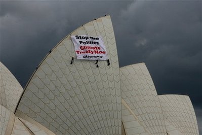 中新網12月15日電 據(jù)法新社報道,一群抗議者15日爬上悉尼歌劇院,拉開橫幅呼吁各國領袖解決分歧,在哥本哈根氣候大會上盡快達成協(xié)議。
