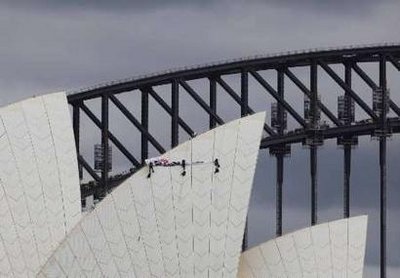 據(jù)報道,在哥本哈根召開的氣候峰會上,發(fā)達國家和發(fā)展中國家兩大陣營之間仍在僵持,各界對峰會結果的悲觀情緒彌漫會場。15日,5名綠色和平組織成員抓著繩索爬上了悉尼歌劇院,并拉開一個100平米大的條幅,上面寫著“不要再玩政治——立刻達成氣候協(xié)議”。事后,這5人被警方逮捕。