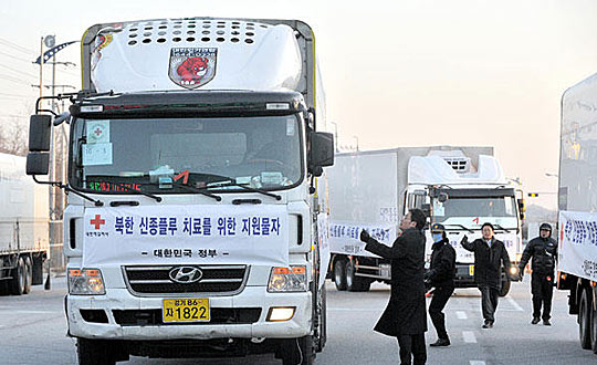 韓國(guó)支援團(tuán)當(dāng)天上午10點(diǎn)左右同朝方人員會(huì)面,利用1小時(shí)30分鐘左右的時(shí)間將50萬人份甲流感治療藥物轉(zhuǎn)載在朝方的車輛上。此前,韓國(guó)政府從朝韓合作基金中劃撥178億韓元,用于購(gòu)買治療甲流的藥物。