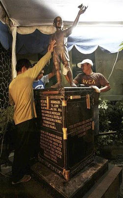 報道稱,銅像此前安放在雅加達的一座公園,但由于遭到公眾的反對才被重新安置在他曾經(jīng)就讀過的學(xué)校,校方的領(lǐng)導(dǎo)和當(dāng)?shù)氐慕逃賳T為這座銅像舉行了簡短而又低調(diào)的揭幕儀式。