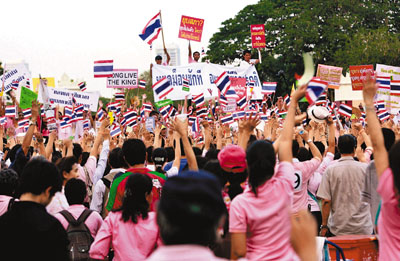 中新網(wǎng)4月3日電 據(jù)香港《文匯報(bào)》報(bào)道,泰國(guó)反獨(dú)裁民主聯(lián)盟(“紅衫軍”)曼谷的示威活動(dòng)持續(xù)近3星期,今天(3日)將再次舉行大規(guī)模反政府活動(dòng),要求總理阿披實(shí)解散國(guó)會(huì)下院。約3000名反對(duì)紅衫軍的群眾昨日(2日)身穿粉紅色衫,在曼谷倫披尼公園集會(huì),反對(duì)“紅衫軍”的解散國(guó)會(huì)及修改憲法等要求。