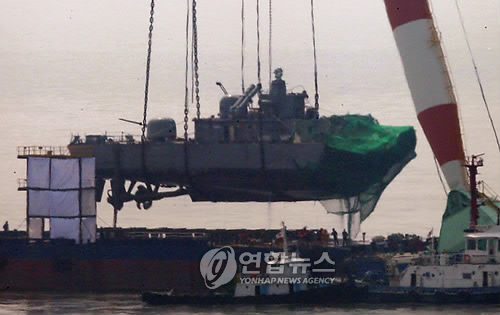中新網(wǎng)4月15日電 據(jù)韓聯(lián)社報(bào)道,韓國(guó)“天安”艦艦尾的打撈工作15日進(jìn)行。由韓國(guó)軍方和民間組成的打撈工作組,15日下午1時(shí)14分利用大型起重機(jī),將“天安”艦船尾打撈出水后,成功放置在駁船上。