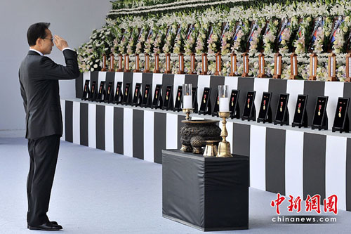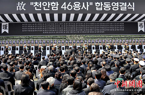 當(dāng)天的遺體告別儀式以對(duì)犧牲官兵的敬禮和默哀開始,然后向46名為國(guó)獻(xiàn)身的官兵追封花郎武功勛章。之后,韓國(guó)海軍總參謀長(zhǎng)金盛贊朗讀吊唁詞,天安艦甲板副士官金玄來(lái)(音)朗讀了追悼詞。