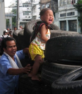 據(jù)英國(guó)《每日郵報(bào)》5月18日?qǐng)?bào)道,攝影師拍到的一張令人震驚的照片顯示,被圍困在泰國(guó)首都曼谷市中心的紅衫軍示威者17日把一名兒童作為人體盾牌使用。